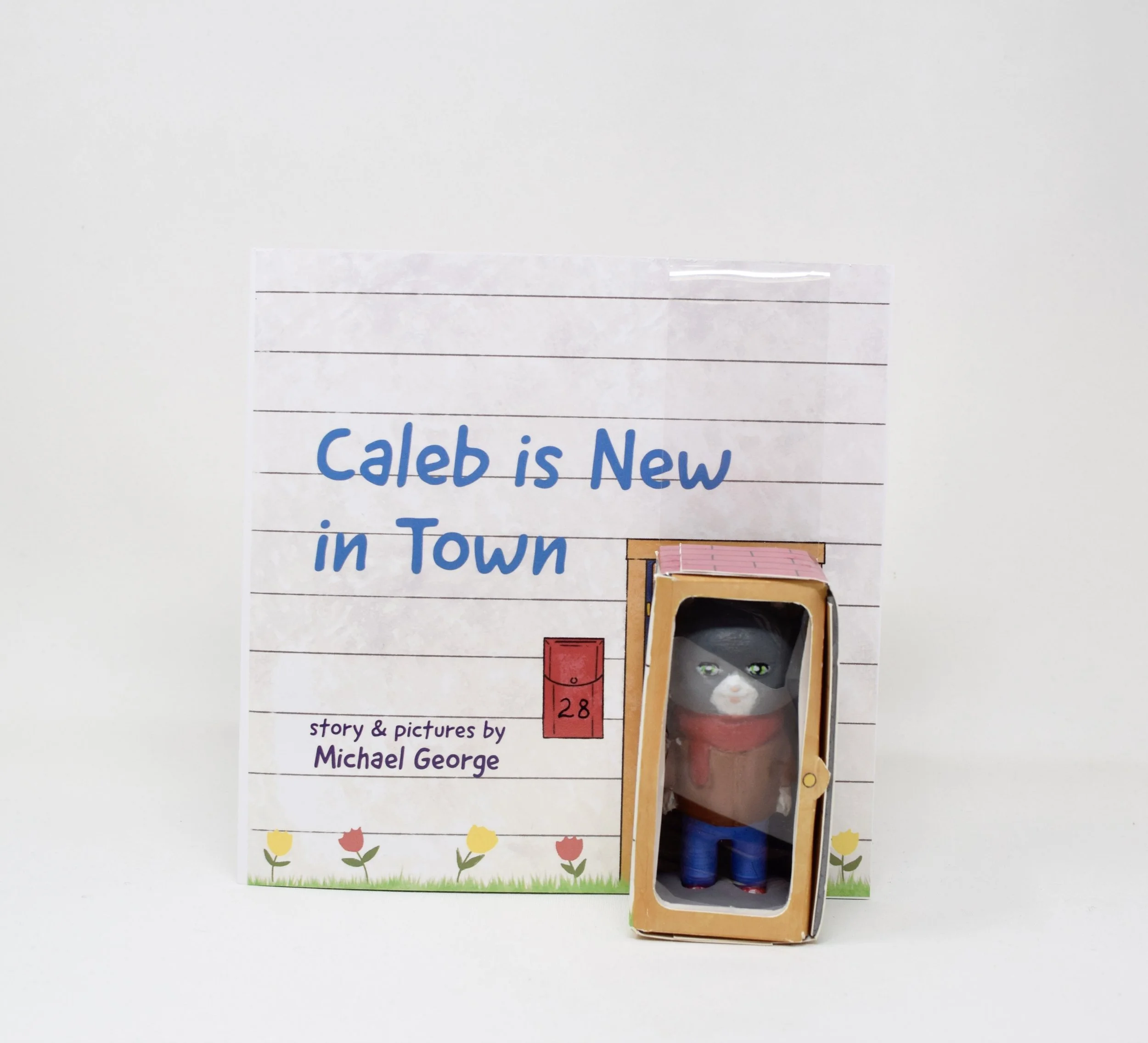 To go along with my book, I decided to add the element of a toy, so I created a four-inch-tall figurine of Caleb that is included along with the book. I remember during my childhood, any time something came with a toy I could play with, whether that be a Burger King kid’s meal toy of Pikachu, a PVC figurine of Scrooge McDuck at the bottom of a cereal box, or a dinosaur book that came with phosphorescent figures of different dinosaur species, my neurons would be activated and my dopamine would spike. I designed the toy in a 3D rendering program and then printed it using a 3D printer. I made sure to cover it in at least 3 coats of primer before painting it with acrylic paint and Posca paint pens and then finally sealing the paint with 3 layers of decoupage. I also designed and printed a box that the Caleb figure can fit inside that is affixed to the cover of his book. This was a fun process, and I spent a lot of time and effort demonstrating my abilities working with both 2D and 3D design.